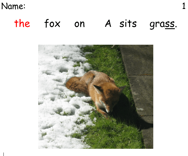 Today’s sentence should be ‘A fox sits on the grass.”. Please ask the children to remind you of the three things we need for a sentence – a capital letter, finger spaces and a full stop.