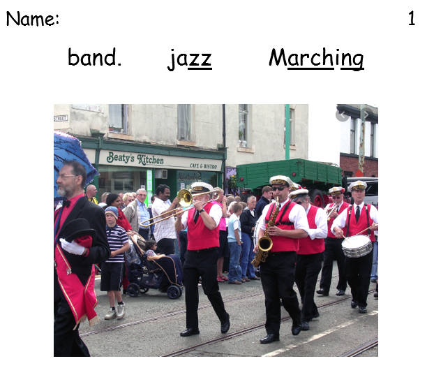 Today’s sentence should be ‘Marching jazz band.”. Please ask the children to remind you of the three things we need for a sentence – a capital letter, finger spaces and a full stop.