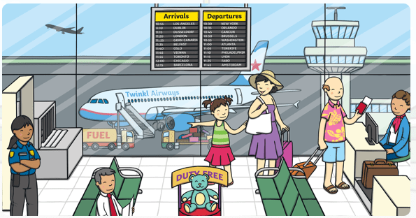 Using the word mat below (to copy word that are not phonically decodable) and their sound mats, ask the children to think of one sentence that relates to this picture. This could be a comment on what they see, or a personal experience that the picture reminds them of e.g. they recall eating burgers at the airport.