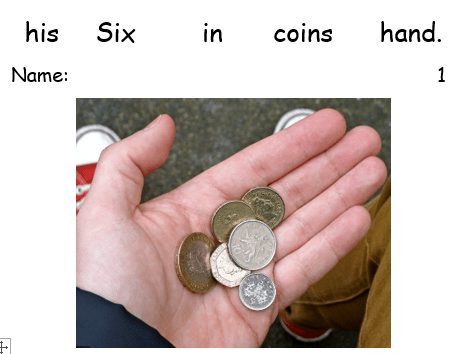 - Once the words are arranged in the correct order, ask your child to attempt copy this sentence on to the sheet doing their best to stay on the line. Again please remind the children about the 3 elements of sentence writing.